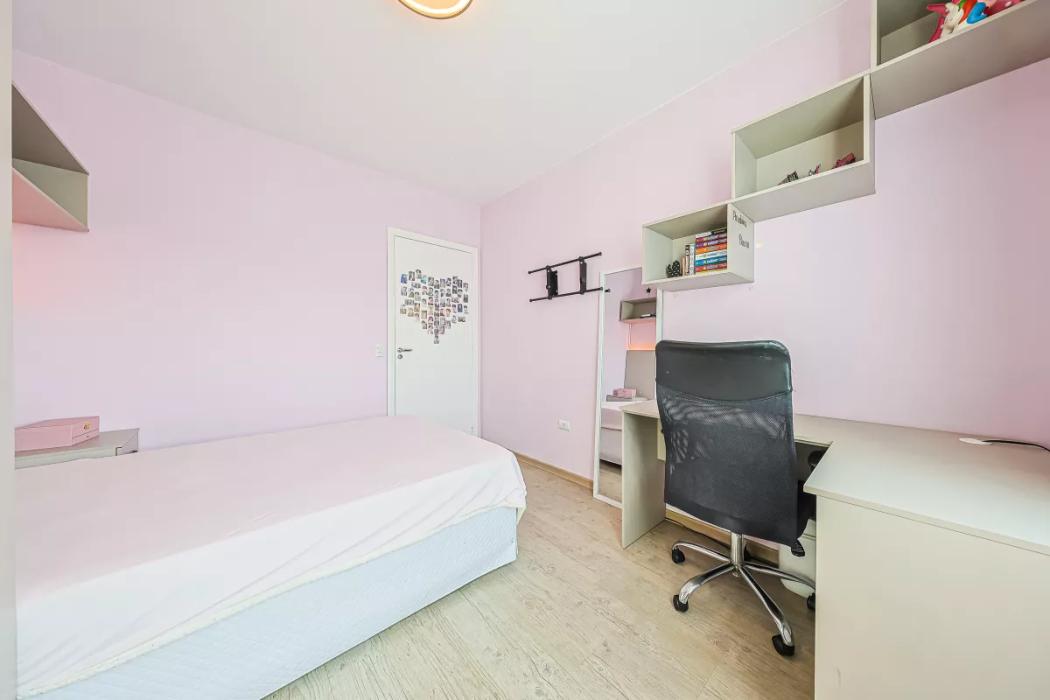 No primeiro piso, medindo 56,08 m², contém 3 quartos sendo um suíte, na suíte há uma sacada fechada com vidro, dois quartos com armários planejados, banheiros com box blindex.